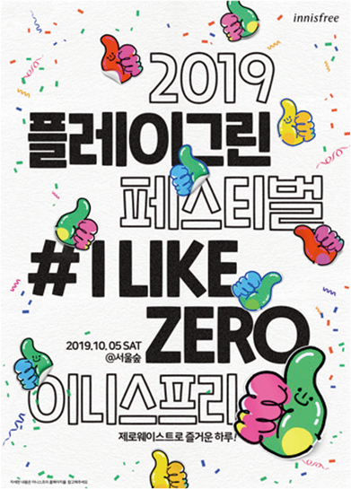 PLAYGREEN Festival delivers that eco-friendly life can be realized with fun and pleasure in everyday life. The 6th PLAYGREEN Festival took place in October 2019 at Seoul Forest under the slogan, “I like zero,” promoting the practice of zero-waste life. At the festival, visitors were provided with multi-use food containers made of bamboo-based materials. Visitors with tumblers were given free beverages. The benefit made by the festival was donated to forestation projects through the innisfree moeum foundation.