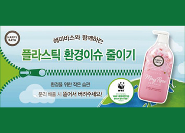HAPPY BATH implemented Less Plastic campaign to recycle plastic in everyday life for "Happier Earth and the Environment", realizing the core brand value of 'wishing every moment of encounter to be happy.' On the World Environment Day in June 2019, promotional campaigns to reduce plastic were implemented both on and offline. Along with the campaign, HAPPY BATH applied easy-peel film in its essence body wash products and donated part of the proceeds from sales to World Wildlife Fund. From the development of easy-torecycle product packaging of body wash products, Happy Bath will actively respond to the plastic waste issue and expand its campaign to promote convenient ways to preserve the environment in everyday life.